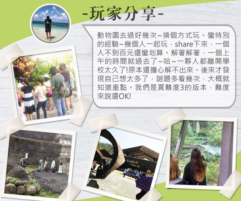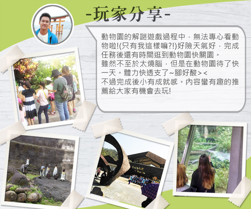 木柵動物園是台灣目前最具代表性的動物園,園區的最大特色是依照原生地最接近的生活環境加以設計布置,動物有自由活動的空間。再加上園區周圍是自然林地,環境優美,是一處適合遊憩的好地方!透過今天的活動結合,不僅讓大家更加了解動物與牠們的習性,同時也能享受解謎破關的樂趣!